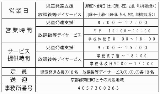 お子さんのライフスタイルを想定し、保護者・保育所・幼稚園・学校等と連携した地域び根差した事業所を目指し、皆様と共に歩む事業所でありたいと願っています。