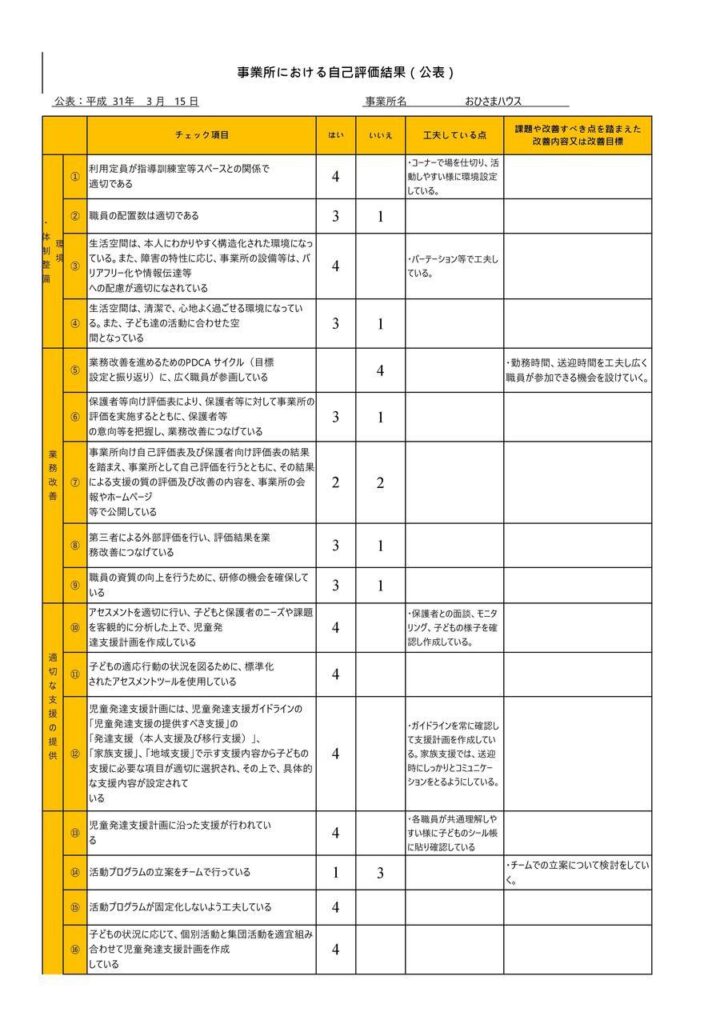 平成31年「おひさまハウス」児童発達支援および放課後等デイサービスの自己評価表の公表を行います。