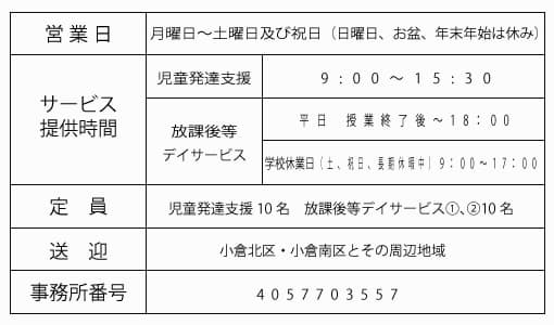 お子さんのライフスタイルを想定し、保護者・保育所・幼稚園・学校等と連携した地域び根差した事業所を目指し、皆様と共に歩む事業所でありたいと願っています。